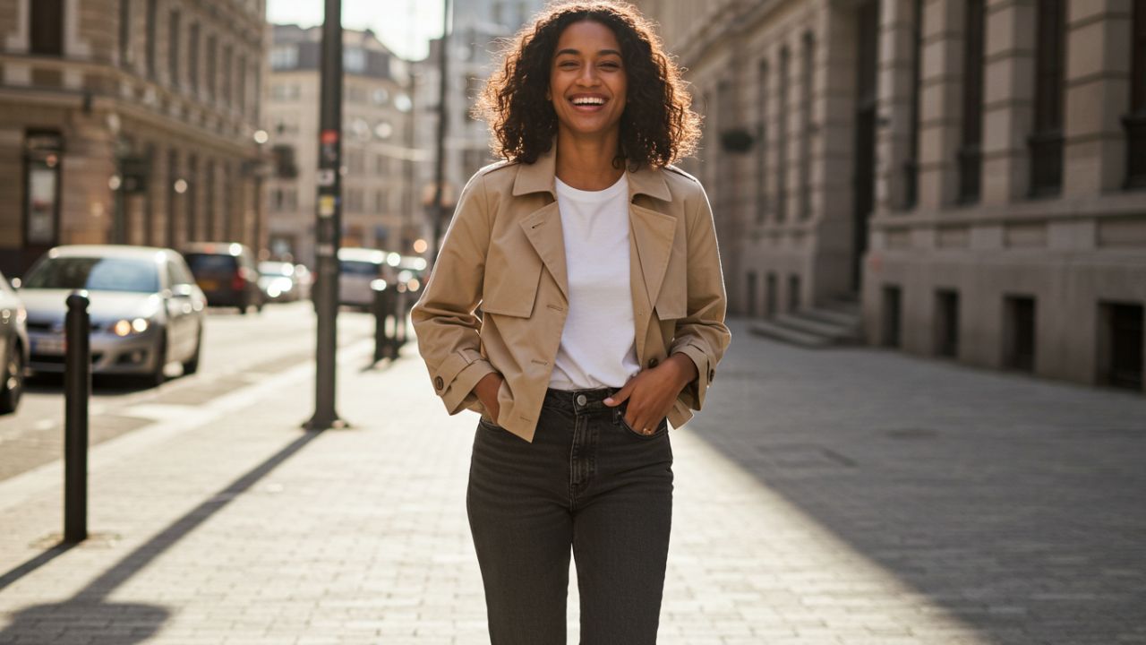 El combo más sencillo se eleva con un cropped trench coat en tono beige o camel. Agrega sneakers blancos o mocasines para un look effortless chic.