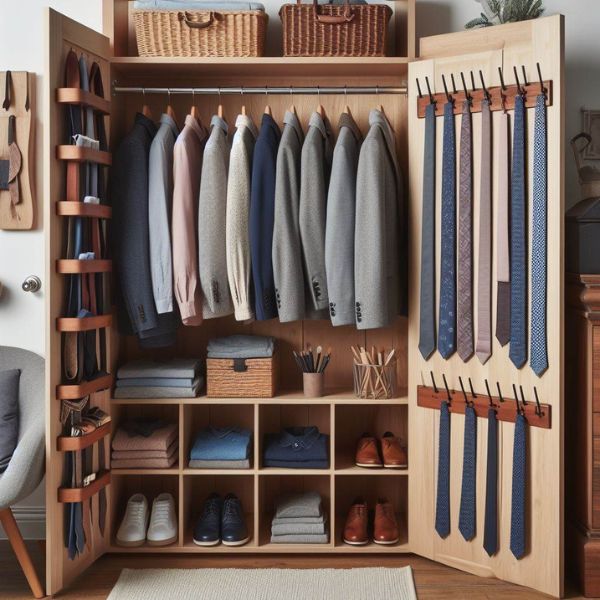 Tu armario tiene rincones insospechados que puedes aprovechar para ganar espacio. Utiliza cestas colgantes para guardar bufandas, bolsos o cinturones. Las puertas del armario también son un gran espacio de almacenamiento: puedes instalar organizadores para colgar corbatas, collares o pañuelos.