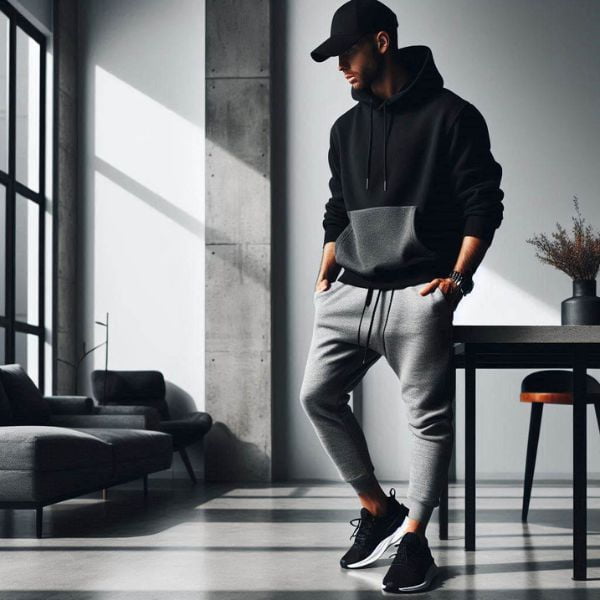 Perfectos para un look masculino cómodo y relajado. Los joggers son pantalones de tela suave con cintura elástica y cordón ajustable. Ideales para estar en casa, hacer ejercicio o salir con amigos. Un ejemplo de outfit: combina unos joggers grises con una sudadera con capucha negra, una gorra de béisbol y zapatillas deportivas para un look cómodo y urbano.