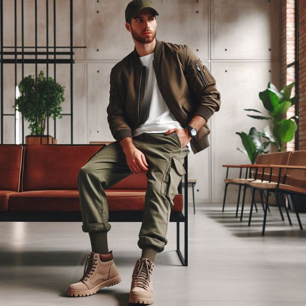 También son una opción práctica y funcional para los hombres que necesitan espacio para guardar sus pertenencias. Los pantalones cargo tienen bolsillos grandes en los laterales y suelen estar confeccionados en materiales resistentes. Para llevarlos puedes intentar con unos pantalones cargo verde oliva con una camiseta blanca, una chaqueta bomber marrón y botas de montaña.