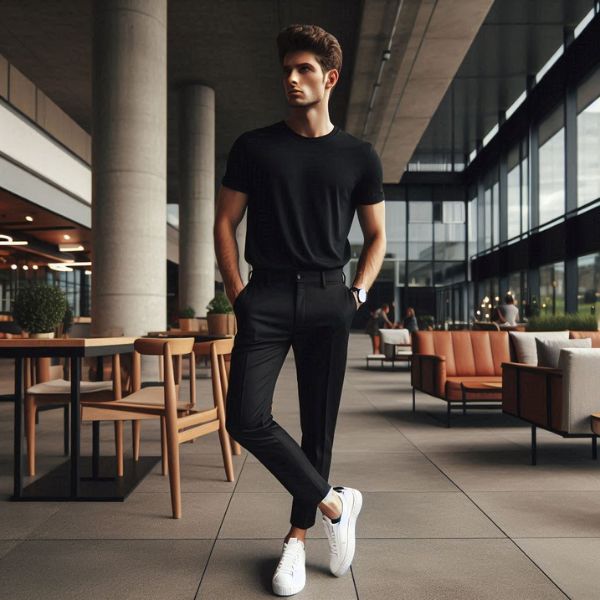 Estos son una opción más formal que los jeans, perfecta para ocasiones semi-formales o de negocios. Los pantalones chinos suelen estar confeccionados en algodón o lino y ofrecen una gran variedad de colores y estilos. Un ejemplo de outfit para un look semi-formal puede ser combinar unos pantalones chinos negros con una playera también en color negro, como complemento unos tenis blancos.