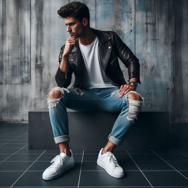 Un clásico atemporal que nunca pasa de moda. Los jeans son versátiles y combinan con todo tipo de prendas, desde camisetas casuales hasta camisas elegantes. Un ejemplo de outfit es elegir unos jeans desgastados y llevarlos con una playera blanca básica, una chaqu eta de cuero y unos tenis blancos para un look masculino casual y relajado.