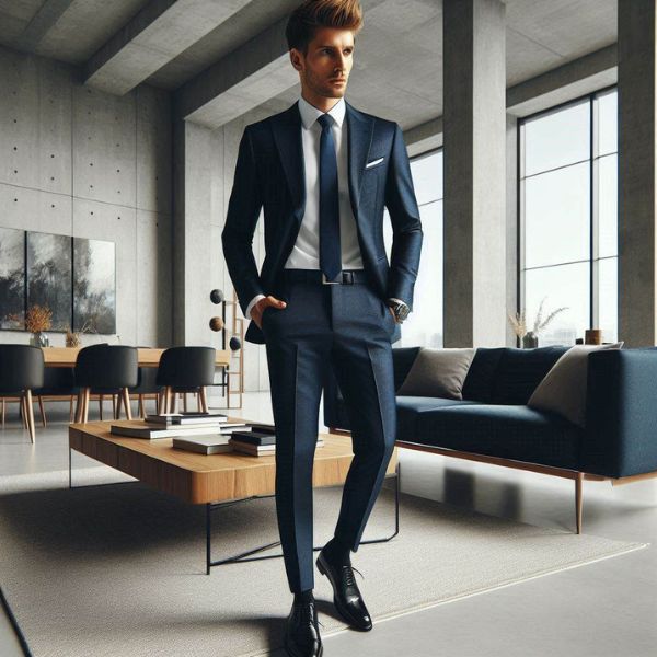 Imprescindibles para eventos formales o de trabajo. Los pantalones de vestir suelen ser de corte recto o slim fit y se combinan con camisas, corbatas y sacos o sueter. Un ejemplo básico para llevarlos es: pantalones de vestir azul marino con una camisa blanca y corbata azul marino con detalles en color plateado.