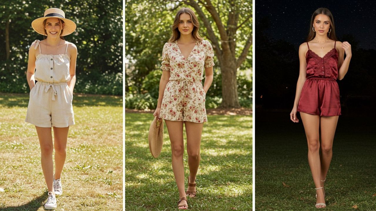 El lino es un tejido elegante y transpirable, ideal para un look más pulido sin perder la frescura. Los rompers en tonos neutros como blanco, beige o arena funcionan bien para reuniones de día o almuerzos al aire libre.