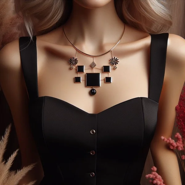 El escote cuadrado es moderno y estructurado. Combínalo con collares cortos y llamativos para enfocar la atención hacia el centro del cuello. Collares tipo choker o con detalles geométricos son perfectos para resaltar la forma cuadrada del escote.