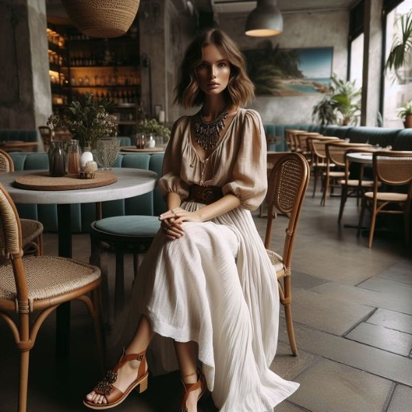 Opta por una falda larga blanca de tela ligera y combínala con una blusa de estilo bohemio en tonos tierra. Puedes complementar el outfit con sandalias en tono nude y un collar statement para un estilo relajado y chic.