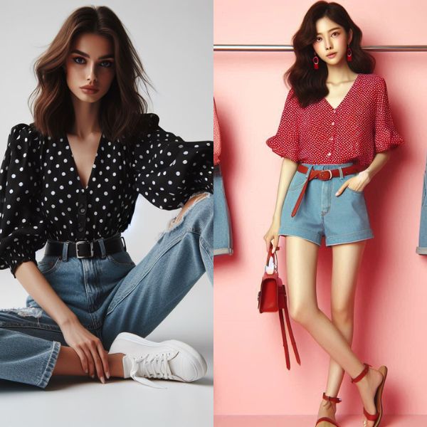 Si optas por lunares puedes utilizar una blusa con estampado blanco sobre fondo negro con unos vaqueros rotos de tiro alto y unas zapatillas blancas clásicas. Otra alternativa es una camiseta de lunares de colores vibrantes, como rojo o azul, con unos shorts y unas sandalias planas.