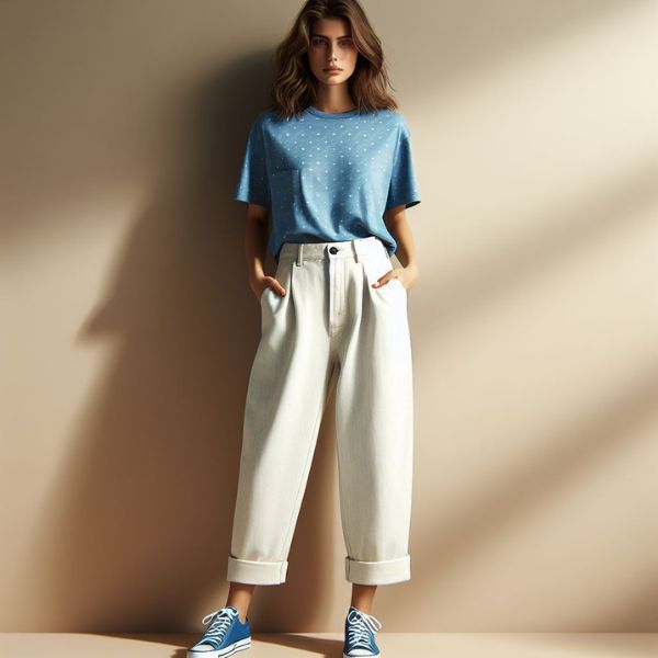 Combina una camiseta azul con lunares blancos con unos pantalones vaqueros blancos sueltos y unas zapatillas azules clásicas.