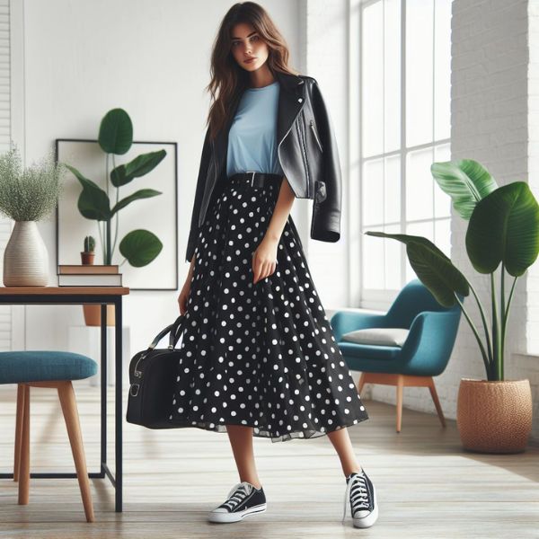 Combina una falda midi de lunares blancos con fondo negro con una camiseta —blanca o del color que prefieras— y una chaqueta de cuero negra.