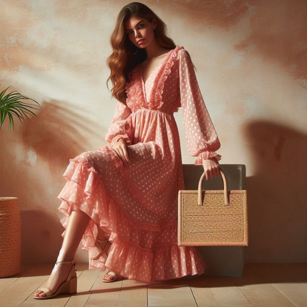 Opta por un vestido largo de lunares rosas con volantes y combínalo con sandalias romanas doradas y un bolso de mimbre beige.