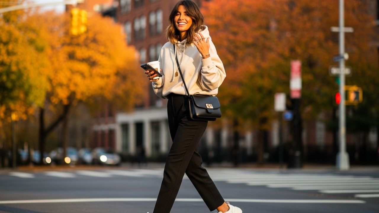 El equilibrio entre lo casual y lo formal. Una sudadera lisa con pantalones sastre y tacones es un look effortless y súper chic.