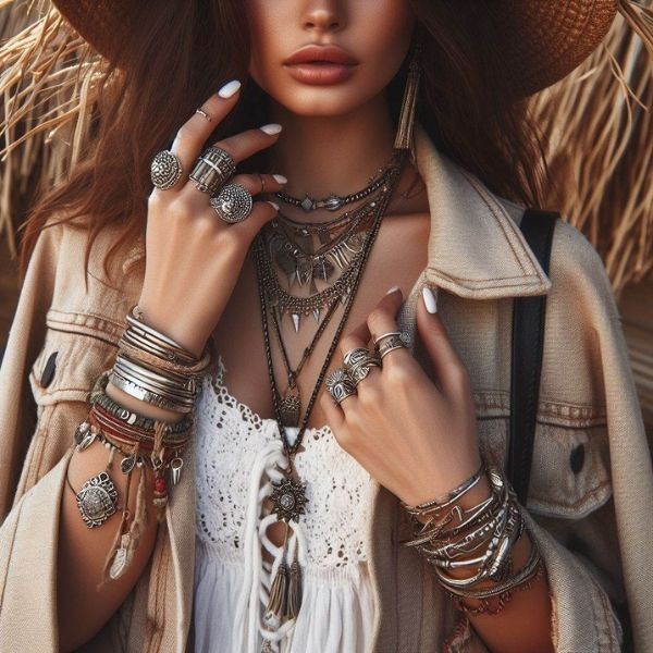 Utiliza accesorios. Estos son clave en el estilo boho chic. Te recomendamos elegir joyería artesanal, como collares largos, pulseras de cuentas y anillos grandes. No temas mezclar metales y piedras naturales para añadir un toque único a tu outfit.