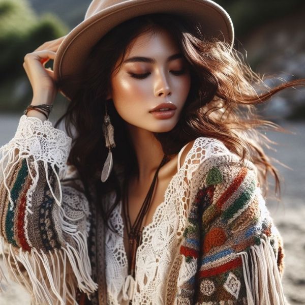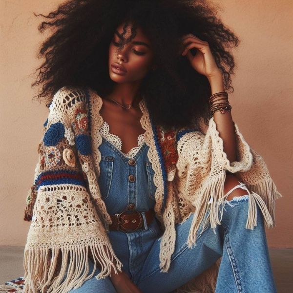 No olvides los flecos y el crochet. Estos elementos son distintivos porque ayudan a conseguir un aire desenfadado. Puedes utilizar chaquetas con flequillos, chalecos de crochet o bolsos con detalles tejidos a tu outfit para un toque hippie.