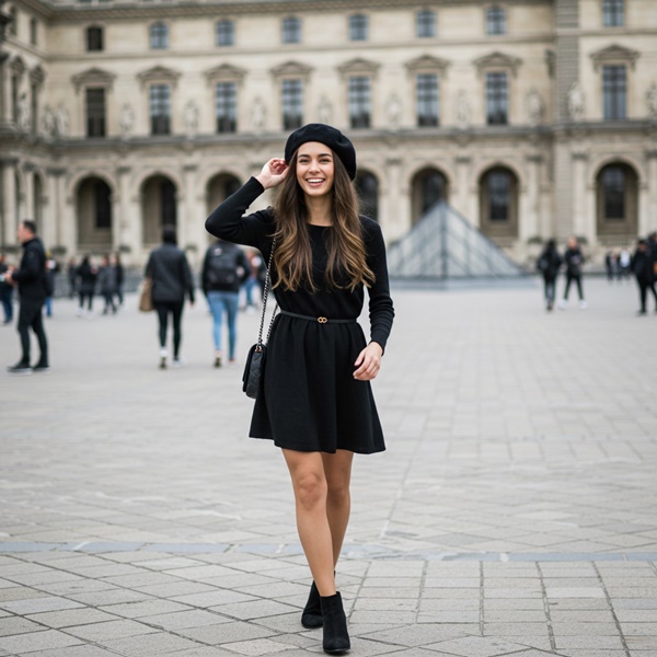 Si decides explorar el Museo Louvre, elige un vestido negro sencillo con una boina y botines a juego. Este look te llevará desde las obras maestras artísticas hasta una cena en un bistró encantador.