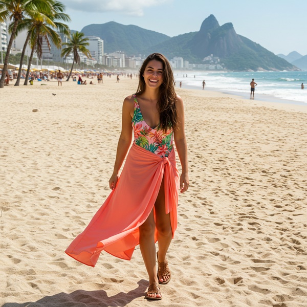 Para disfrutar de las playas de Copacabana, opta por un bikini vibrante con una falda pareo y unas sandalias cómodas. Añade accesorios llamativos y una amplia pamela para un toque glamouroso. Este look es perfecto para un día soleado en la playa.