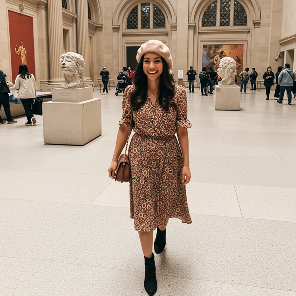 Si decides pasar una tarde en el Museo Metropolitano de Arte, opta por un vestido midi estampado y botines; añade una boina para un toque artístico. Este look te llevará desde la cultura en el MET hasta una cena elegante en el Upper East Side.