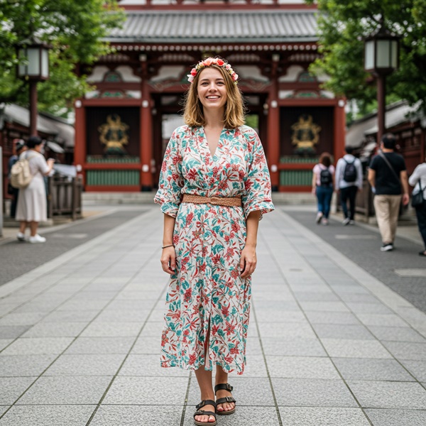 Si planeas visitar los tranquilos templos de Asakusa, opta por un kimono moderno con sandalias cómodas. Añade una diadema de flores para un toque romántico. Este atuendo te permitirá sumergirte en la cultura japonesa mientras mantienes un estilo a la moda.