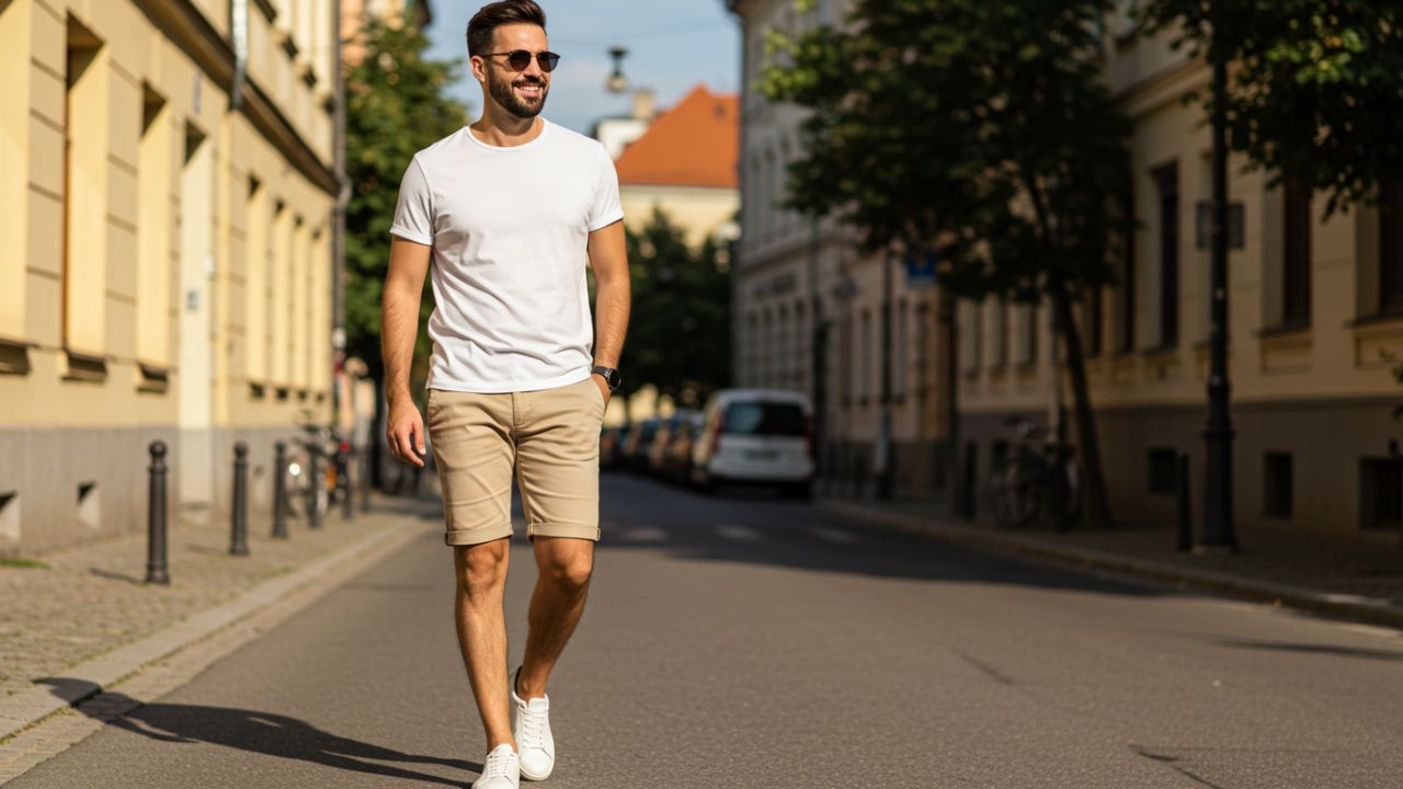 Este es el combo infalible. Una camiseta blanca entallada, bermudas de algodón beige o verde militar y tenis blancos te dan un look limpio, relajado y moderno.