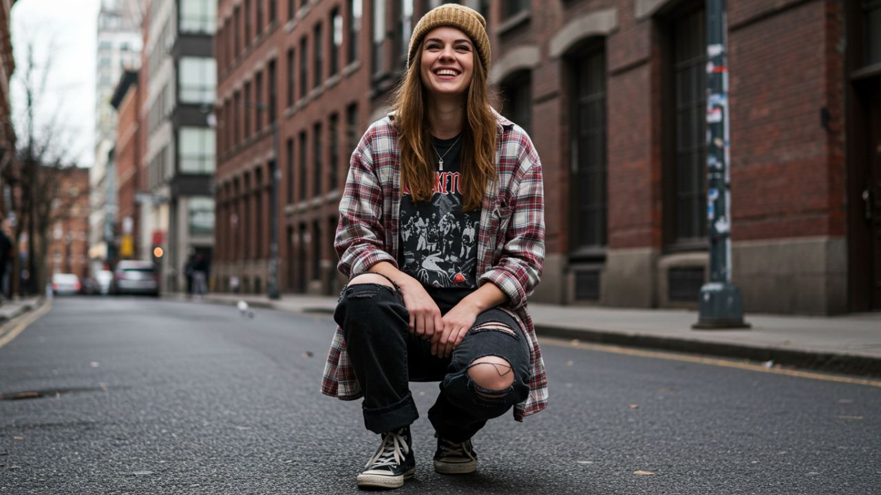 - Prendas básicas: Camisas de franela, jeans rasgados, camisetas vintage de bandas, chaquetas de cuero y sudaderas oversized.